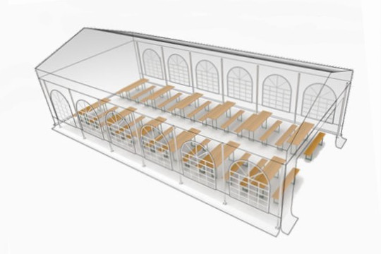 Przetestowaliśmy, iż nasz namiot pomieści około 64 miejsc stojących lub około 40 miejsc siedzących na 5 kompletach biesiadnych o długości 2m. Jeśli chcecie Państwo ustawić krzesła w "salę kinową" zmieścicie wtedy ok. 46 osób.