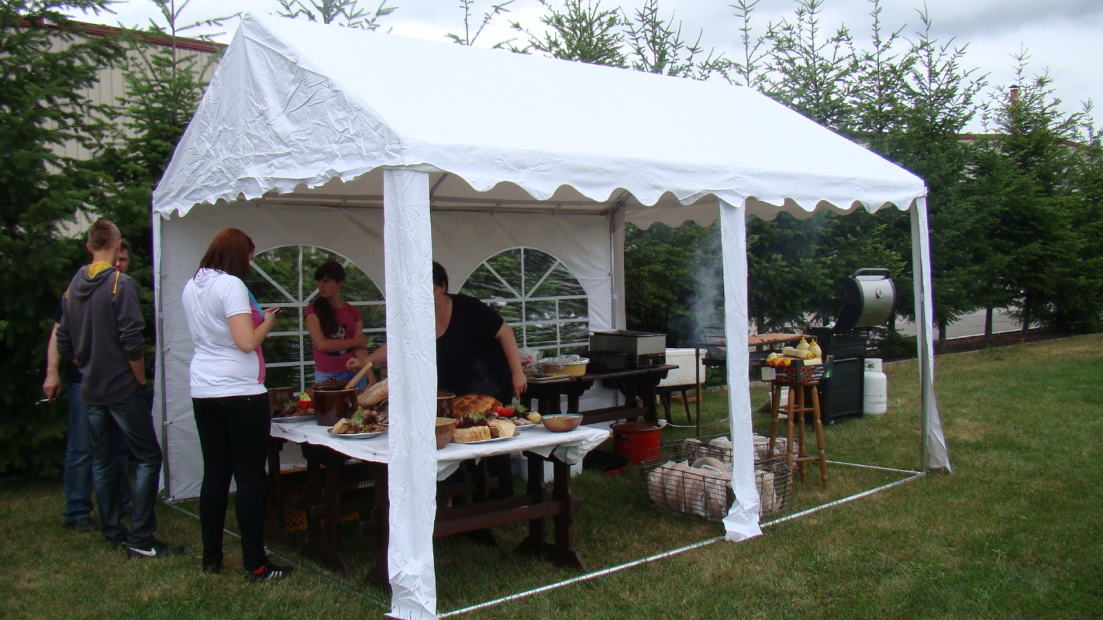 Przetestowaliśmy, iż nasz namiot pomieści około 144 miejsca stojące lub około 96 miejsc siedzących na kompletach biesiadnych o długości 2m Jeśli chcecie Państwo ustawić krzesła w "salę kinową" zmieścicie wtedy 105 osób. |